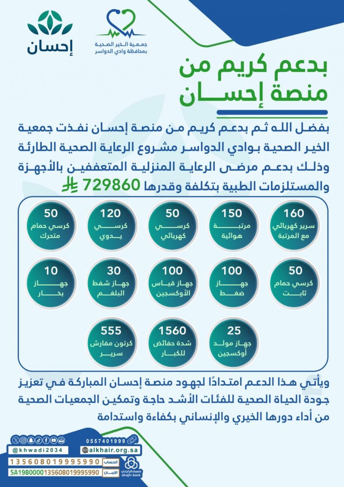 الرعاية الصحية الطارئة: دعم مرضى الرعاية المنزلية المتعففين بالأجهزة والمستلزمات الطبية بتكلفة تجاوزت 729 ألف ريال بدعم من منصة إحسان.
