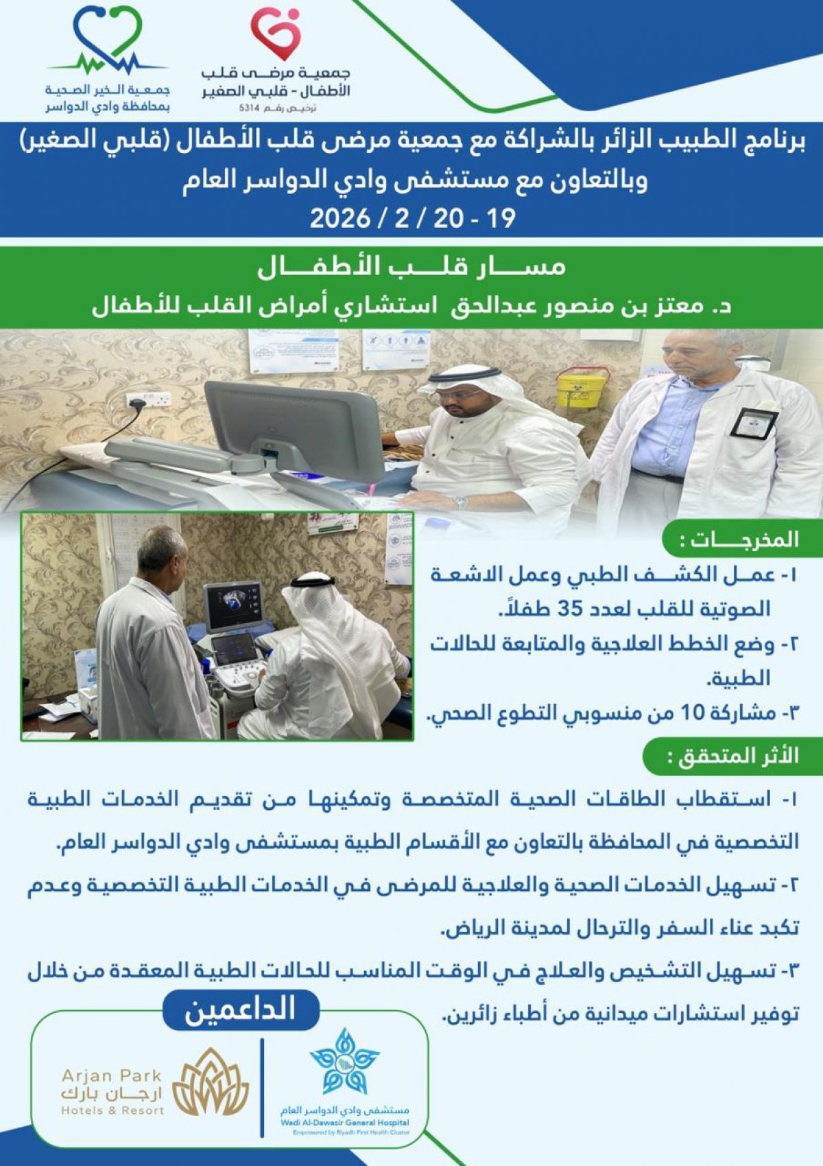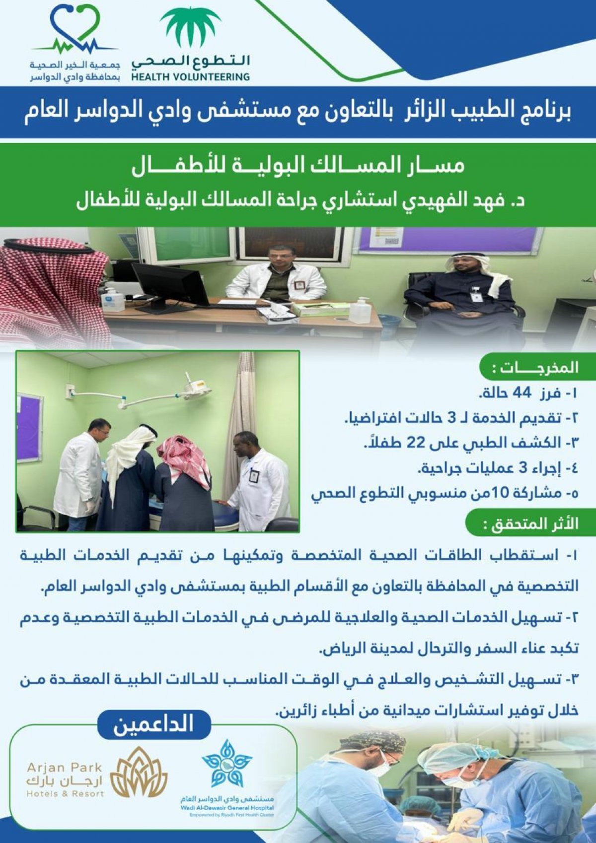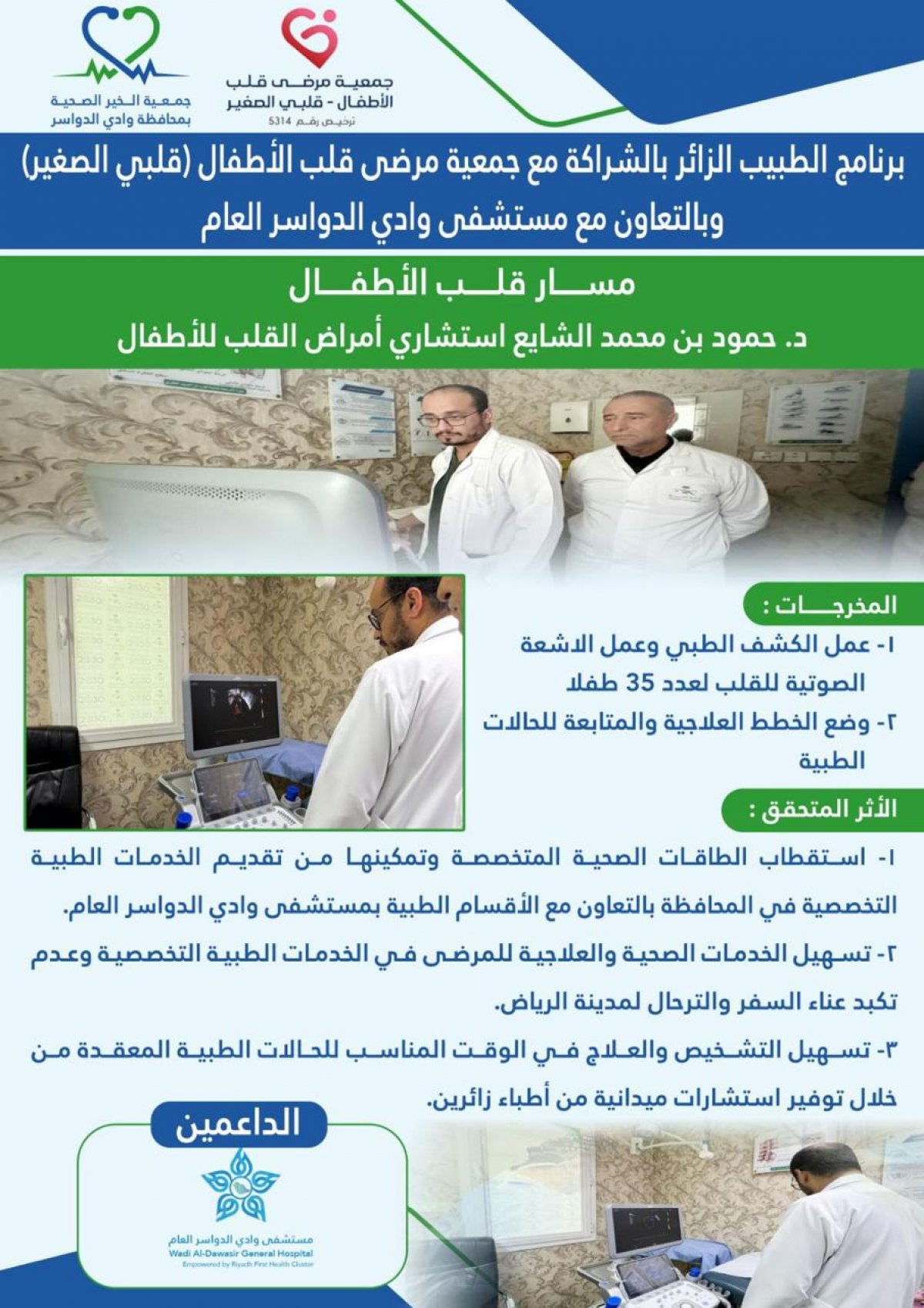 برنامج الطبيب الزائر: استقطاب كفاءات استشارية في تخصصات جراحة المسالك البولية للأطفال وأمراض قلب الأطفال؛ لإجراء الكشوفات والعمليات الجراحية وتجنيب المرضى عناء السفر.