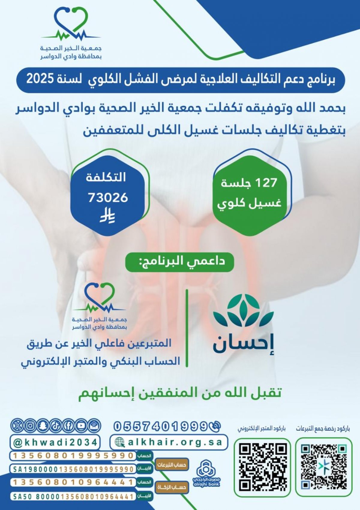 دعم مرضى الفشل الكلوي: التكفل بتكاليف 127 جلسة غسيل كلوي للمتعففين خلال عام 2025 بمبلغ إجمالي قدره 73,026 ريالاً.